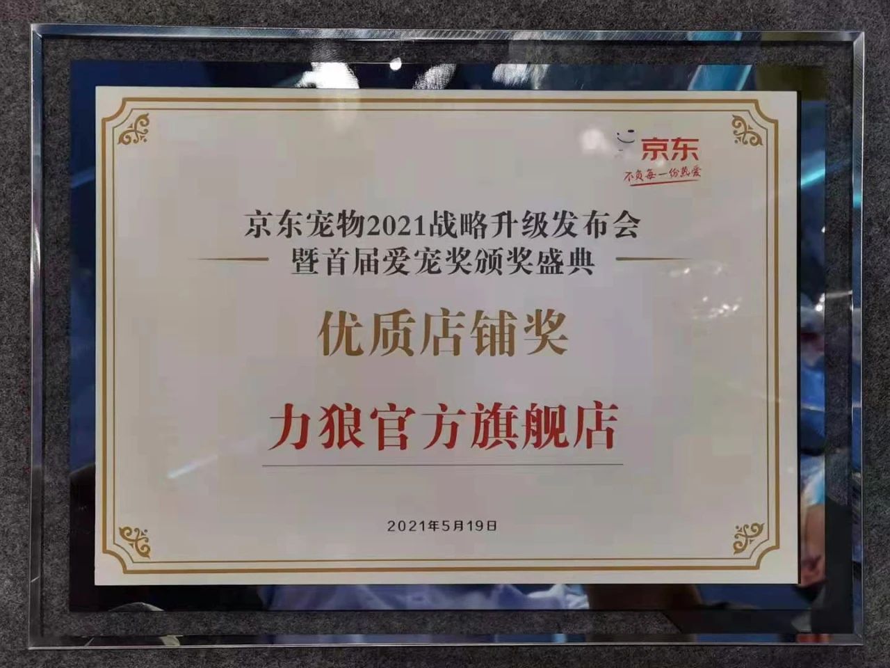 展會同期,在京東寵物2021年戰(zhàn)略升級發(fā)布會暨首屆“愛寵獎”頒獎盛典上,我公司力狼官方旗艦店榮獲“優(yōu)質(zhì)店鋪獎”,再次獲得了行業(yè)同仁的認可。