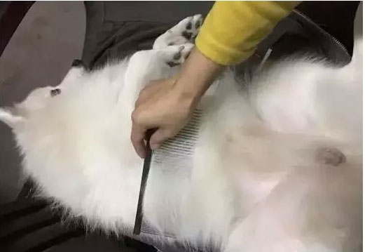 6. 如果狗狗毛發較厚,梳子難以梳透,可以一層一層分開梳理,先梳理被毛,梳順之后掀開再梳理底絨,最后再統一梳理。